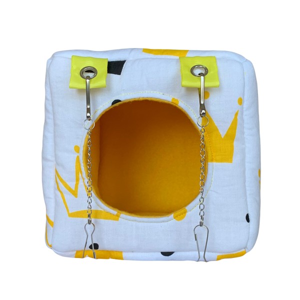 Квадратний будиночок "Гризюк" для гризунів з принтом Корони (білий). З теплим й затишним будиночком "Гризюк" Ваш вихованець ніколи не нудьгуватиме, будиночок швидко стане одним з найулюбленіших місць у клітці, а всім відомо, що щасливий вихованець - здоровий вихованець! У м'якому квадратному гамачку дуже затишно спати та відпочивати. Підвісний квадратний будиночок "Гризюк" також може стати чудовим аксесуаром у клітці та надійним укриттям для вихованця.