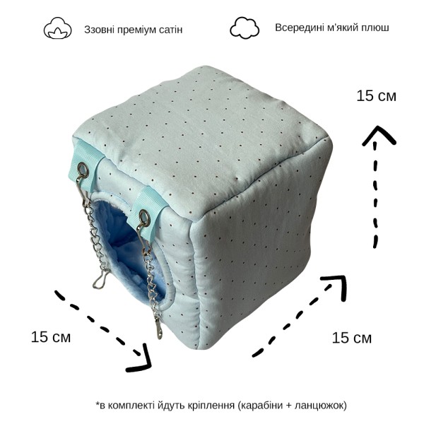 Квадратний будиночок "Гризюк" для гризунів з принтом Блакитні Горошки. З теплим й затишним будиночком "Гризюк" Ваш вихованець ніколи не нудьгуватиме, будиночок швидко стане одним з найулюбленіших місць у клітці, а всім відомо, що щасливий вихованець - здоровий вихованець! У м'якому квадратному гамачку дуже затишно спати та відпочивати. Підвісний квадратний будиночок "Гризюк" також може стати чудовим аксесуаром у клітці та надійним укриттям для вихованця.