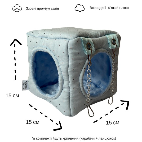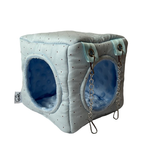 Кубічний гамак-лежанка підійде для відпочинку або ігор домашніх гризунів всіх розмірів. Форма цього гамака виглядає як куб який має 2 отвори, і в середині дуже м'якенький з усіх сторін. Розмір гамака 15*15*15 см, і він підійде до будь-якої клітки, а також його можна просто покласти, або підчепити на спеціальні карабіни які йдуть у комплекті. Такий тип гамаків урізноманітнить побут у клітці, та викликає інтерес у кожного гризуна.