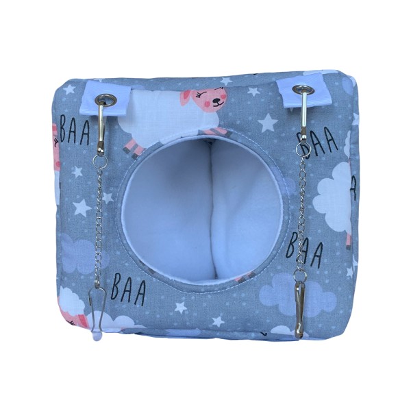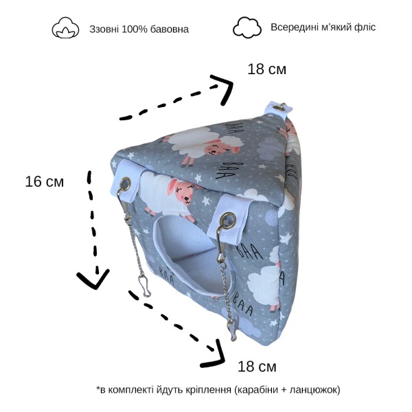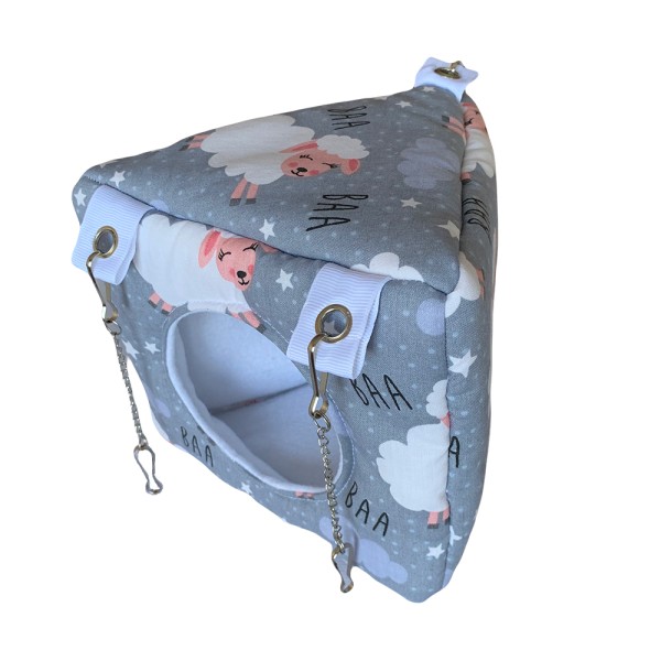 Трикутний будиночок, підійде для відпочинку або ігор домашніх гризунів. Форма цього гамака виглядає як трикутна призма, яка дуже м'яка з усіх сторін. Розмір гамака становить 16*18*18 см, підійде до будь-якої клітки, і його можна просто покласти, або підчепити на спеціальні карабіни які йдуть у комплекті. Загалом такий тип гамаків урізноманітнить побут у клітці, та викликає інтерес у кожного гризуна.