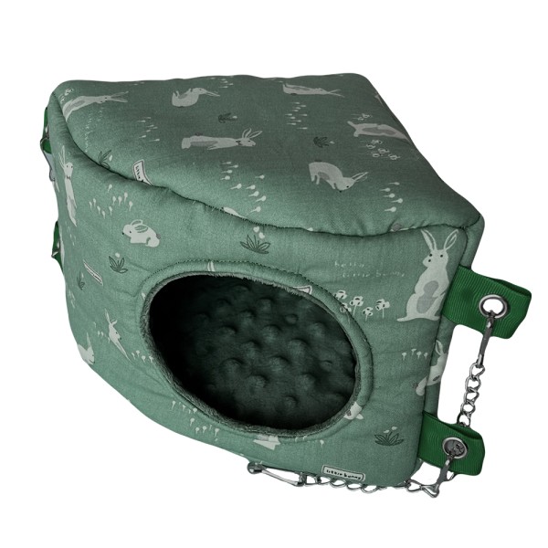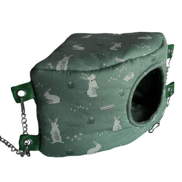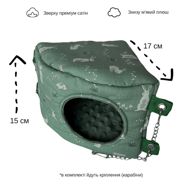 Трикутний кутовий будиночок, підійде для відпочинку або ігор домашніх гризунів. Форма цього гамака виглядає як трикутна призма, яка дуже м'яка з усіх сторін. Розмір гамака становить 15*17*25 см, підійде до будь-якої клітки, і його можна просто покласти, або підчепити на спеціальні карабіни які йдуть у комплекті. Такий тип гамаків урізноманітнить побут у клітці, та викликає інтерес у кожного гризуна.