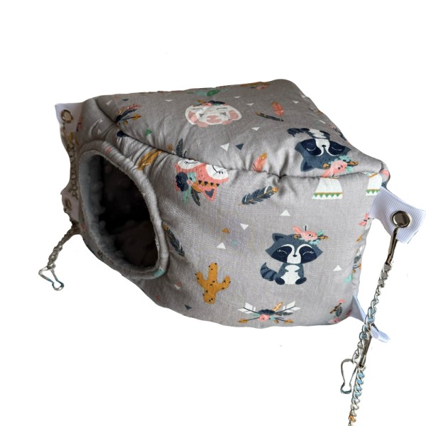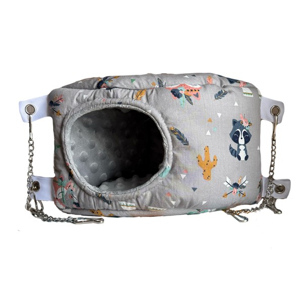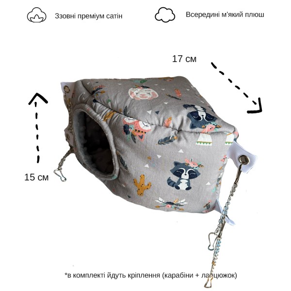 Трикутний кутовий будиночок, підійде для відпочинку або ігор домашніх гризунів. Форма цього гамака виглядає як трикутна призма, яка дуже м'яка з усіх сторін. Розмір гамака становить 15*17*25 см, підійде до будь-якої клітки, і його можна просто покласти, або підчепити на спеціальні карабіни які йдуть у комплекті. Такий тип гамаків урізноманітнить побут у клітці, та викликає інтерес у кожного гризуна.