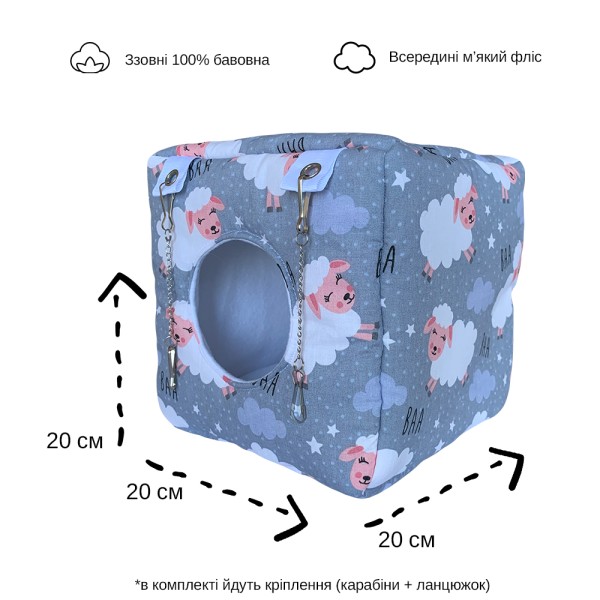 Квадратний будиночок "Гризюк" для гризунів з принтом Баранчики (сірий). З теплим й затишним будиночком "Гризюк" Ваш вихованець ніколи не нудьгуватиме, будиночок швидко стане одним з найулюбленіших місць у клітці, а всім відомо, що щасливий вихованець - здоровий вихованець! У м'якому квадратному гамачку дуже затишно спати та відпочивати. Підвісний квадратний будиночок "Гризюк" також може стати чудовим аксесуаром у клітці та надійним укриттям для вихованця.