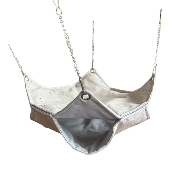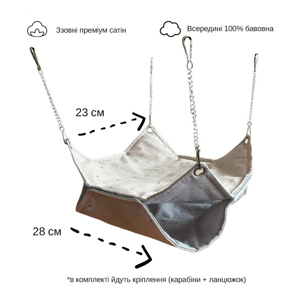 Двоповерховий гамак підійде для відпочинку або ігор домашніх гризунів всіх розмірів. Форма цього гамака складається з двох рівнів, верхній та нижній поверх виконані з сатину. Розмір гамака 23*28 см, підійде до будь-якої клітки, в якій їх чіпляють на спеціальні карабіни які йдуть у комплекті. Загалом такий тип гамаків урізноманітнить побут у клітці, викликає інтерес у кожного гризуна, а також позитивно буде впливати на рухову активність.
