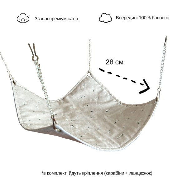 Одноповерховий гамак підійде для відпочинку або ігор домашніх гризунів всіх розмірів. Розмір гамака 28*28 см, підійде до будь-якої клітки, в якій їх чіпляють на спеціальні карабіни які йдуть у комплекті. Загалом такий тип гамаків урізноманітнить побут у клітці, викликає інтерес у кожного гризуна, а також позитивно буде впливати на рухову активність.